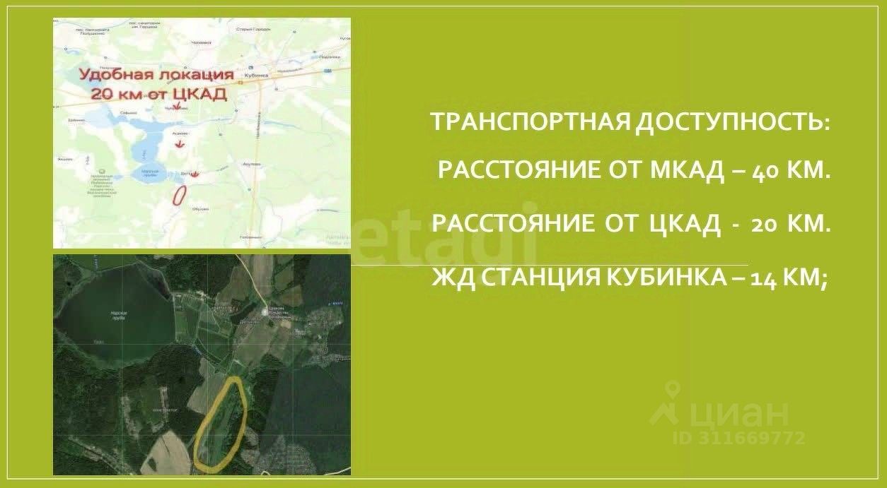 Удобное расположение участка обеспечивает отличную транспортную доступность: всего 40 км от МКАД и 20 км от ЦКАД. Вы сможете быстро добраться до столицы по Минскому шоссе или Наро-Фоминскому шоссе. Ближайшая железнодорожная станция Кубинка находится всего в 14 км, что позволяет легко планировать поездки в Москву и обратно.
