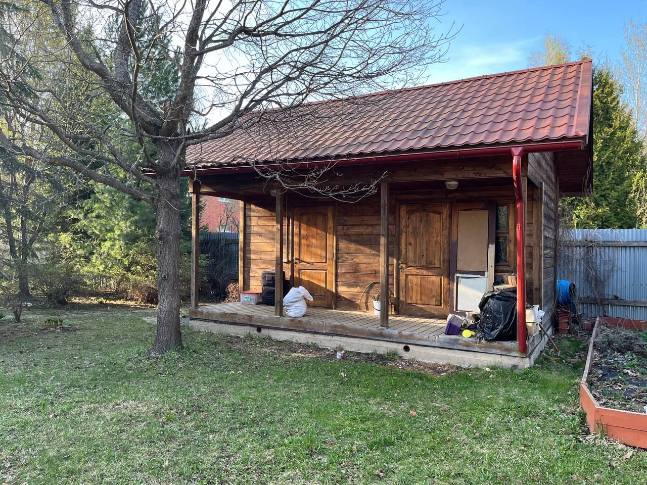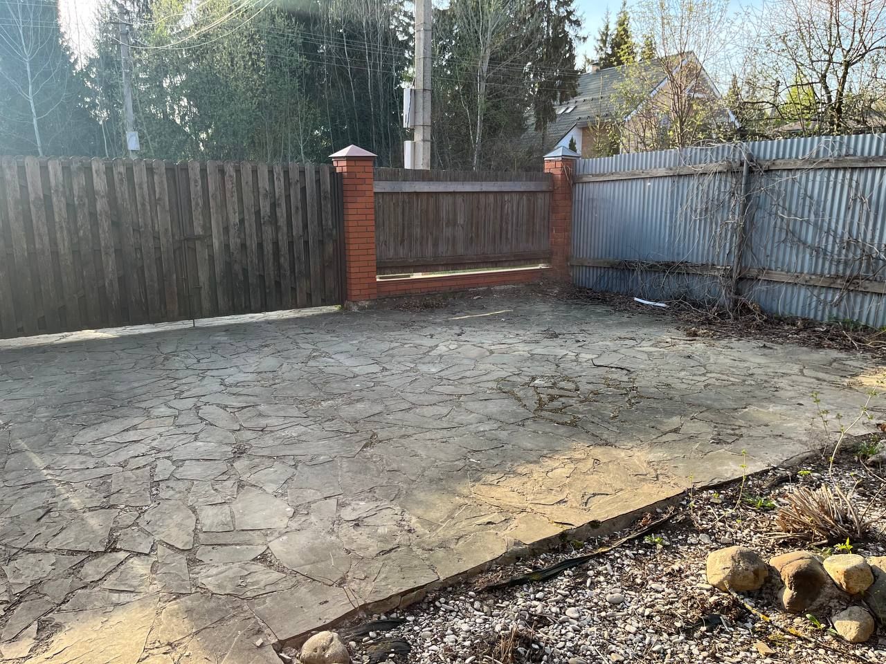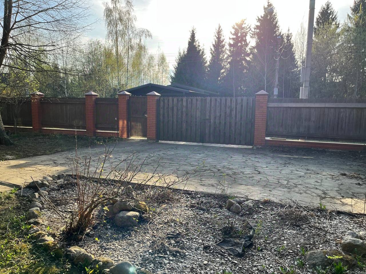 Участок благоустроен: хозблок 30 м, мощение (въезд, веранда, дорожки) — натуральный дикий камень, посевной газон.