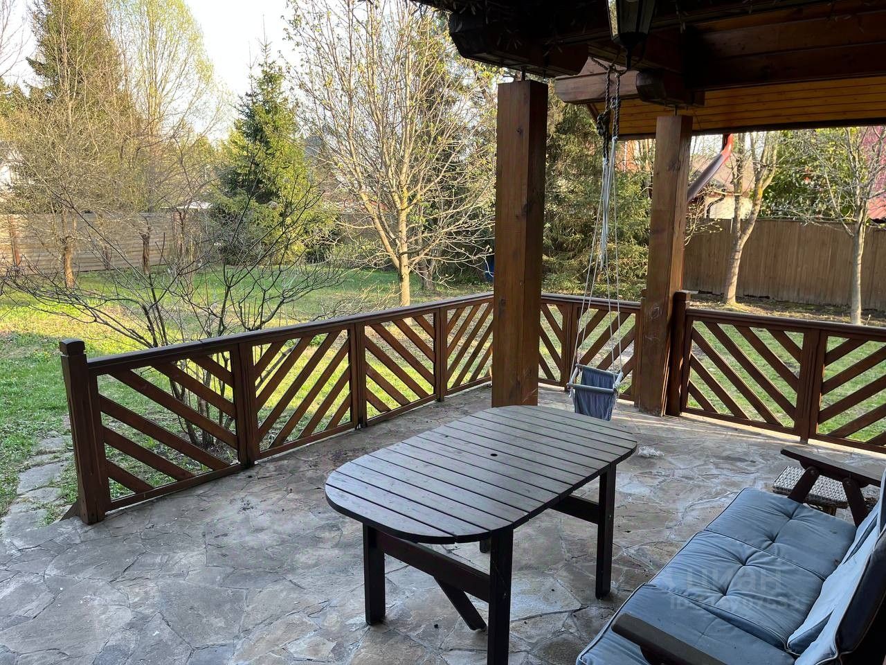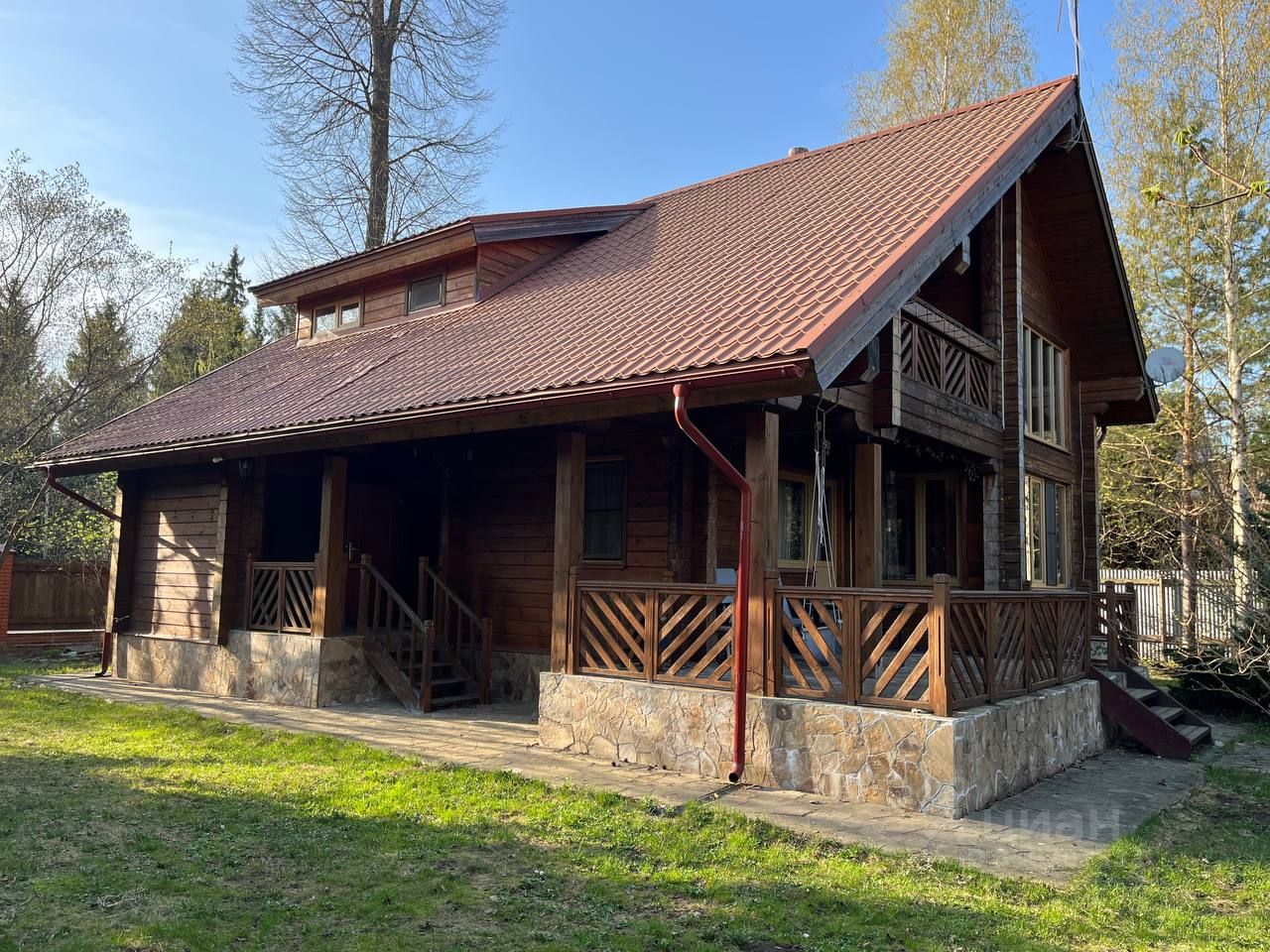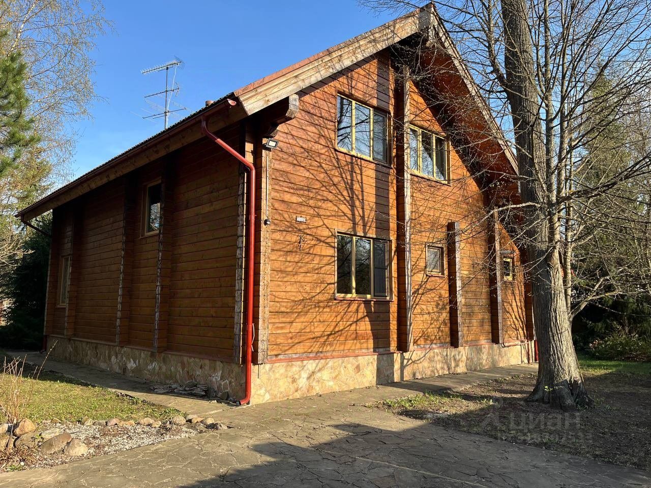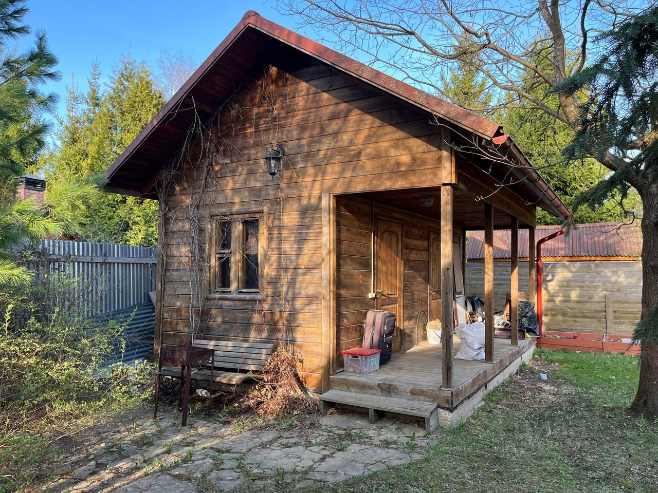 Участок благоустроен: хозблок 30 м, мощение (въезд, веранда, дорожки) — натуральный дикий камень, посевной газон.