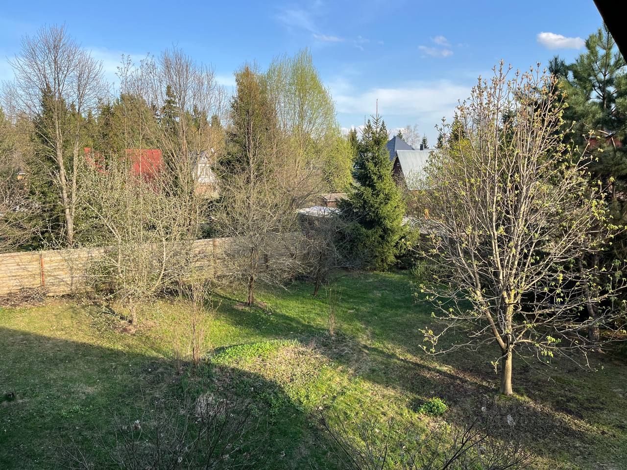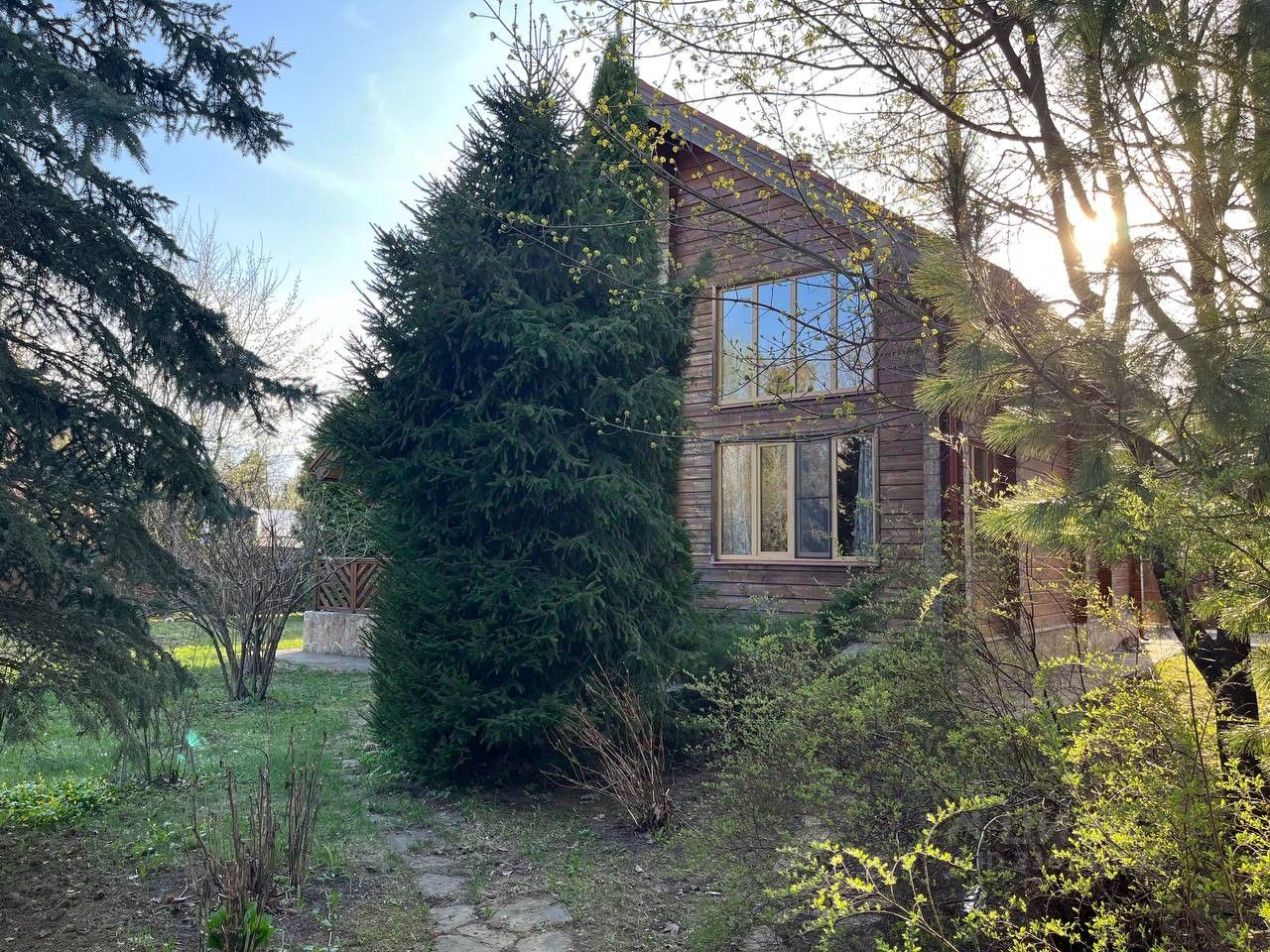 Сад с многолетними плодовыми деревьями и кустарниками: яблони, сливы, смородина, малина, клубника, на участке высокие хвойные и лиственные деревья, цветущие растения.