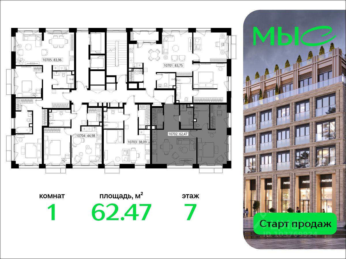 В продаже квартира площадью 62.47 кв. м без отделки на 7 этаже 8 этажного дома. Квартира находится в премиальном жилом комплексе ''МЫС'' (Застройщик - MR Group).