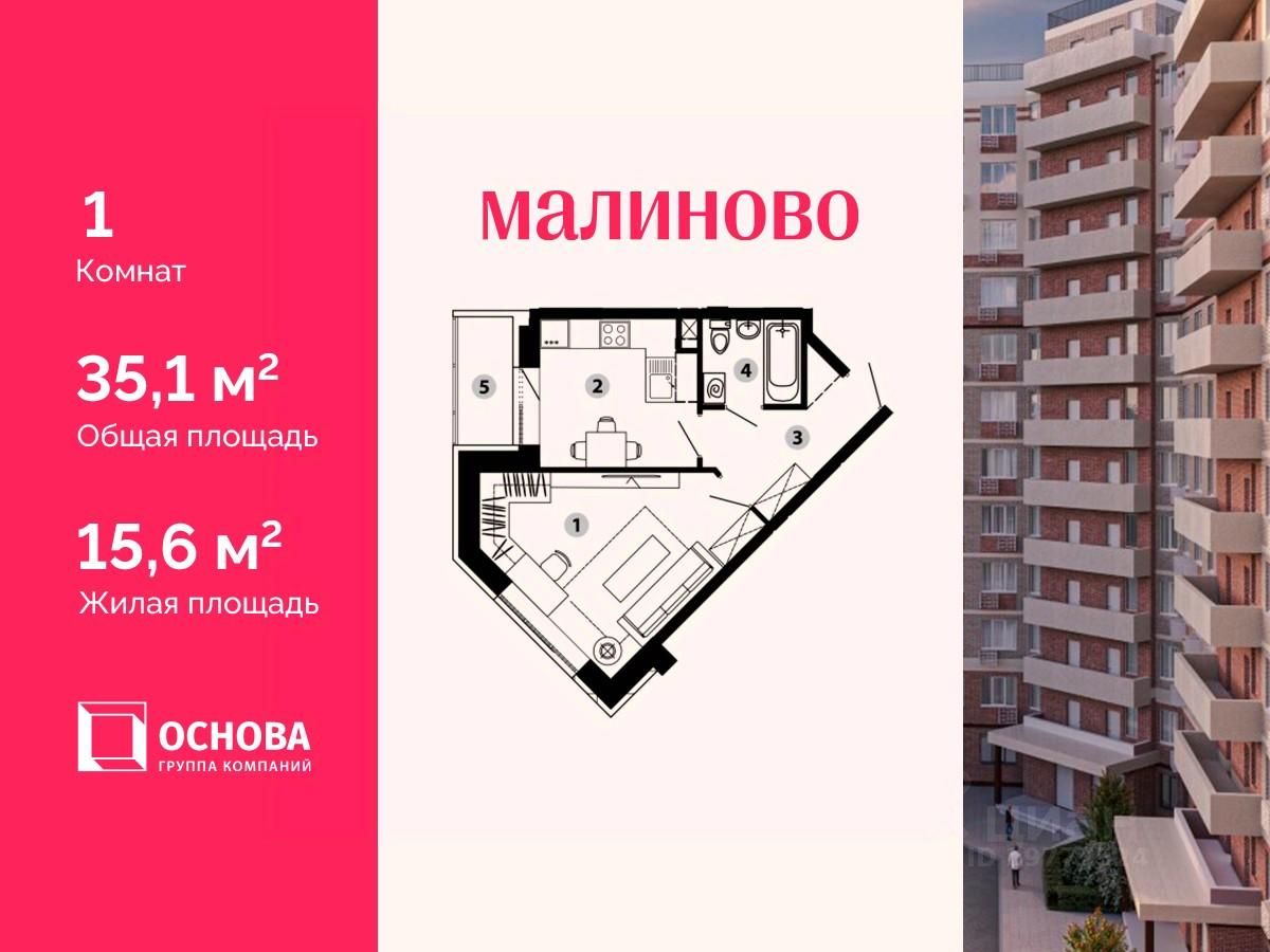 Продается 1-комн. кв-ра площадью 35,1 кв.м на 5 этаже 12 этажного монолитно-кирпичного дома в ЖК ''Малиново''.