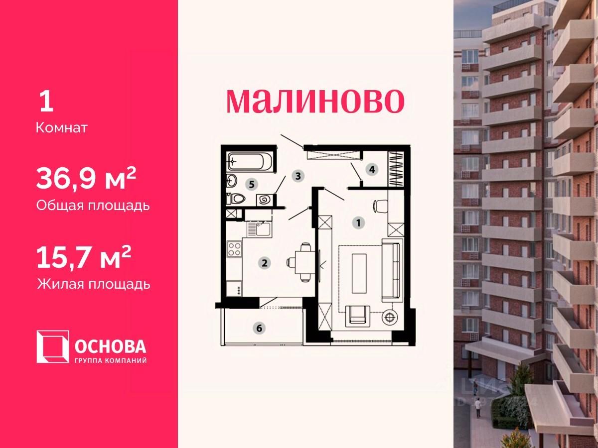 Продается 1-комн. кв-ра площадью 36,9 кв.м на 4 этаже 12 этажного монолитно-кирпичного дома в ЖК ''Малиново''.
